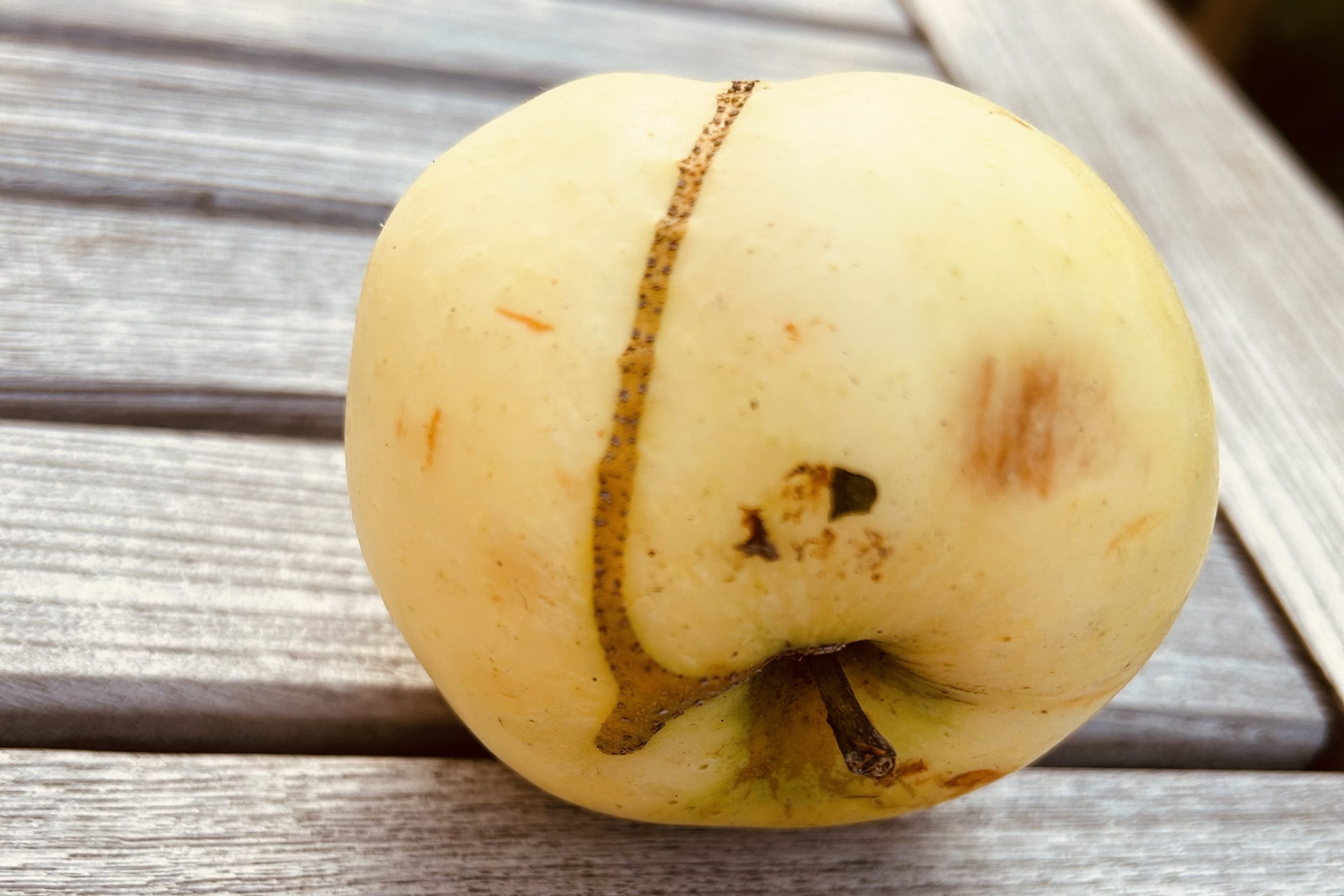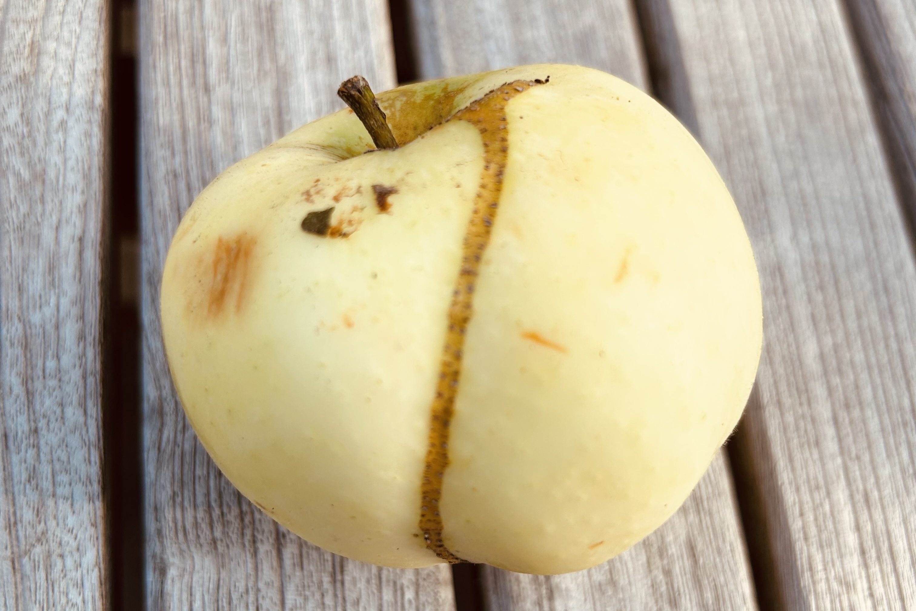 Bei einem Klarapfel, der eigentlich zu Apfelkompott verarbeitet werden sollte habe ich ein auffälliges Muster bemerkt. Einen Streifen der sich über eine Hälfte des Apfels zog.