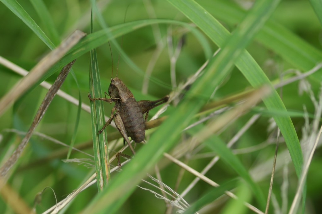 Dieses Tier habe ich am Rand der Wiese im Gebüsch gesehen. Die Strauchschrecke ist ebenfalls eine Langfühlerschrecke aus der Familie der Laubheuschrecken. Sie bevorzugt Lebensräume mit höherer Vegetation, wie hoch wachsende Wiesen, Waldränder, Hecken. Die erwachsenen Tiere ernähren sich in erster Linie räuberisch von kleinen Insekten, aber auch Pflanzen wie Löwenzahn oder Brennnesseln gehören zum Nahrungsspektrum. Ihren Gesang erzeugen die Männchen mit den Flügeldecken. Die Weibchen legen die Eier im Boden oder in Totholz ab. Die Larven schlüpfen erst nach zwei Überwinterungen im übernächsten Jahr. Diese Art benötigt nur wenig Wärme und ist bereits ab 7 Grad Celsius aktiv.