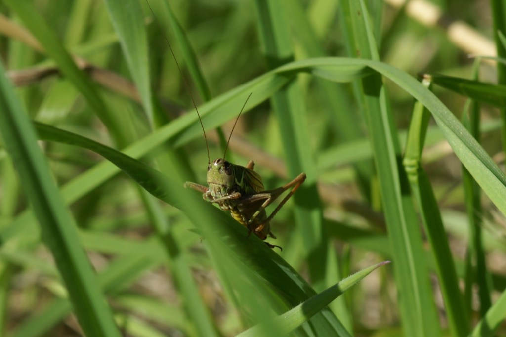 Diese Heuschrecke lebt in großer Zahl auf unsere Wiese. Diese Art ist eine Kurzfühlerschrecke und gehört zur Familie der Feldheuschrecken. Sie sind zwar beflügelt, in der Regel aber flugunfähig. Die Tiere nutzen die Flügel zur Erzeugung ihres Gesangs, indem sie den Sägekamm an der Innenseite der Hinterschenkel über die Kanten der Flügeldecke streichen. Ab Juni lässt sich diese Heuschrecke beobachten.