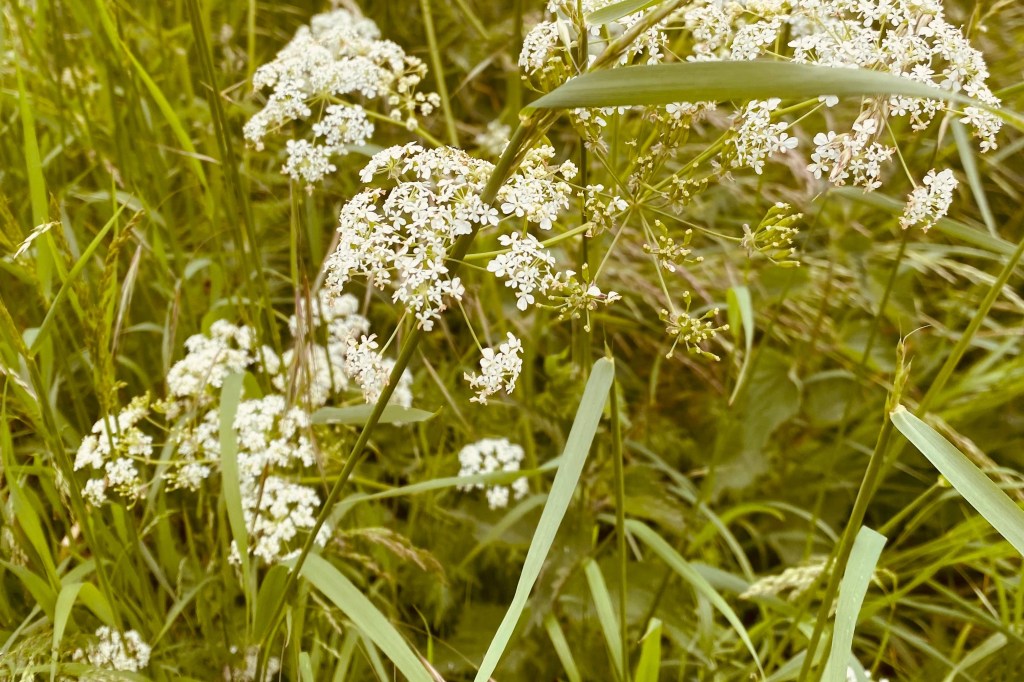 Wir haben uns die Wiese unter den Obstbäumen genauer angeschaut und waren erstaunt, dass sie doch sehr graslastig ist. Ein Tupfer Wiesenschaumkraut, vereinzelt eine wilde Möhre oder Wiesenbärenklau. Ganz tapfer hält sich zur Zeit noch ein einzelner Hahnenfuß, ich bin stolz auf ihn.