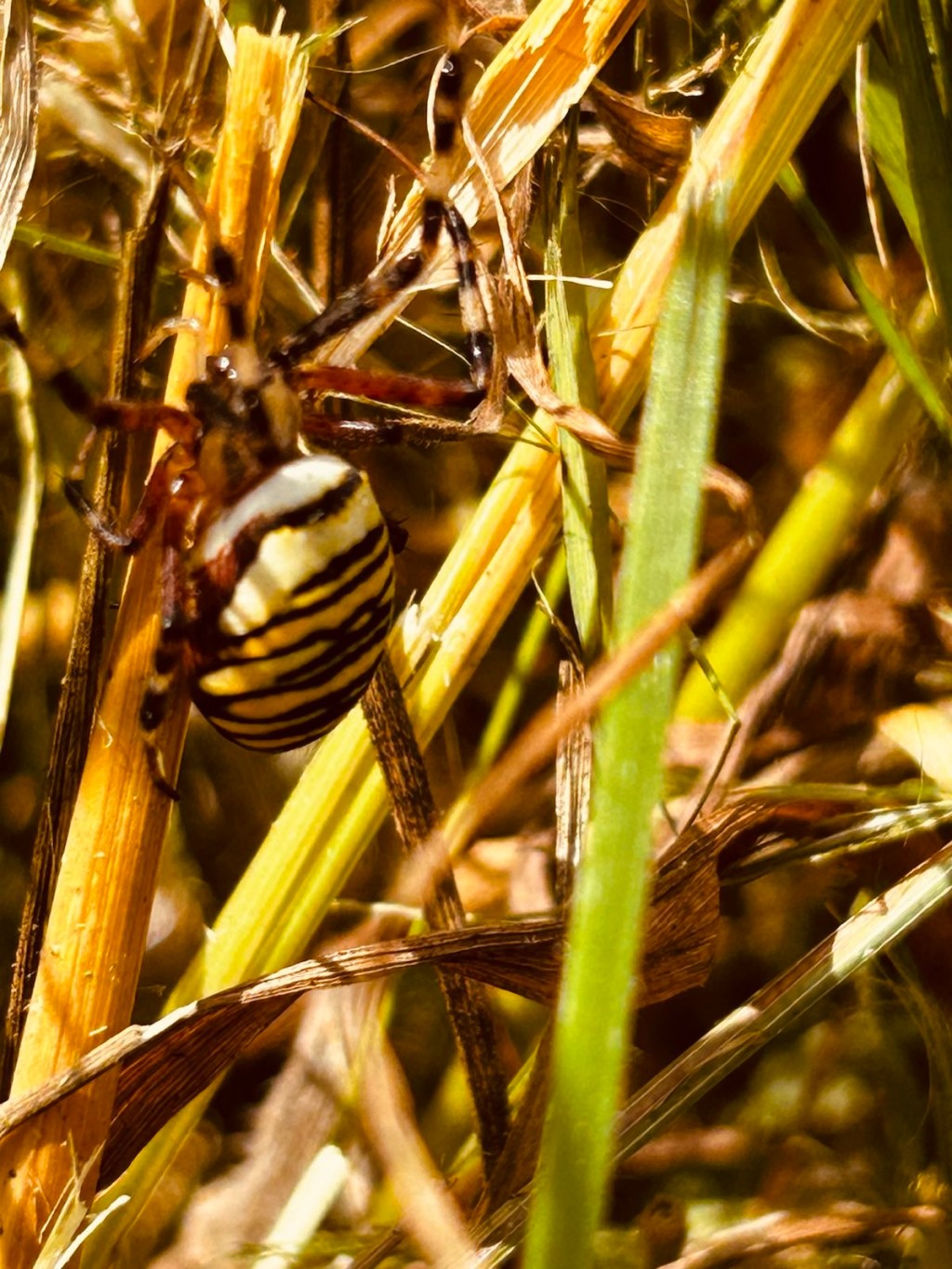 Eine erste Mähaktion hat stattgefunden. Anne, Christine, Petra und andere haben mit Sense und Harke anstrengende Arbeit geleistet. Die Grashaufen beweisen ihren Einsatz. Beim Mähen haben sie die Wespenspinne entdeckt. Diese kannte vorher noch niemand von uns.