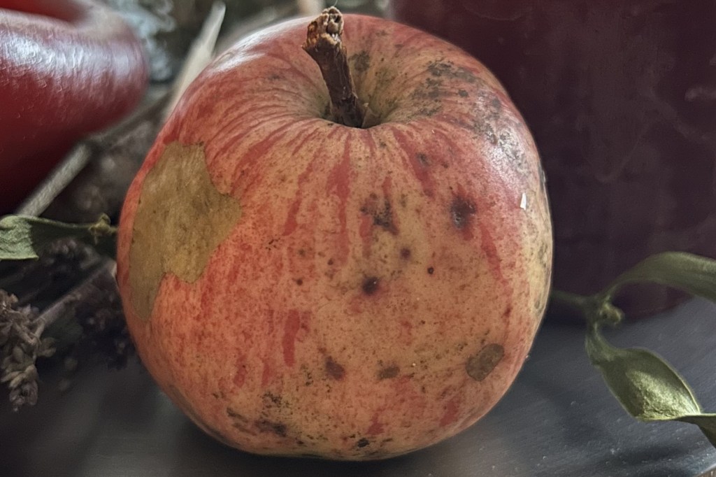 An einem regenfeuchten Dezembertag bin ich über die Streuobstwiese Mühlenkampstraße gegangen. Immer wieder fallen mir die hutzeligen, knorrigen Bäume in der Mitte auf. In diesem Jahr wurde mein Bestimmungsversuch bestätigt, die Apfelsorte ist James Grieve. Heute leuchtete mir ein kleiner, roter Apfel aus dem Gras entgegen. Ein wenig schorfig, ein wenig unsymmetrisch aber so ein bezaubernder Lichtblick in der wintergrauen Welt.