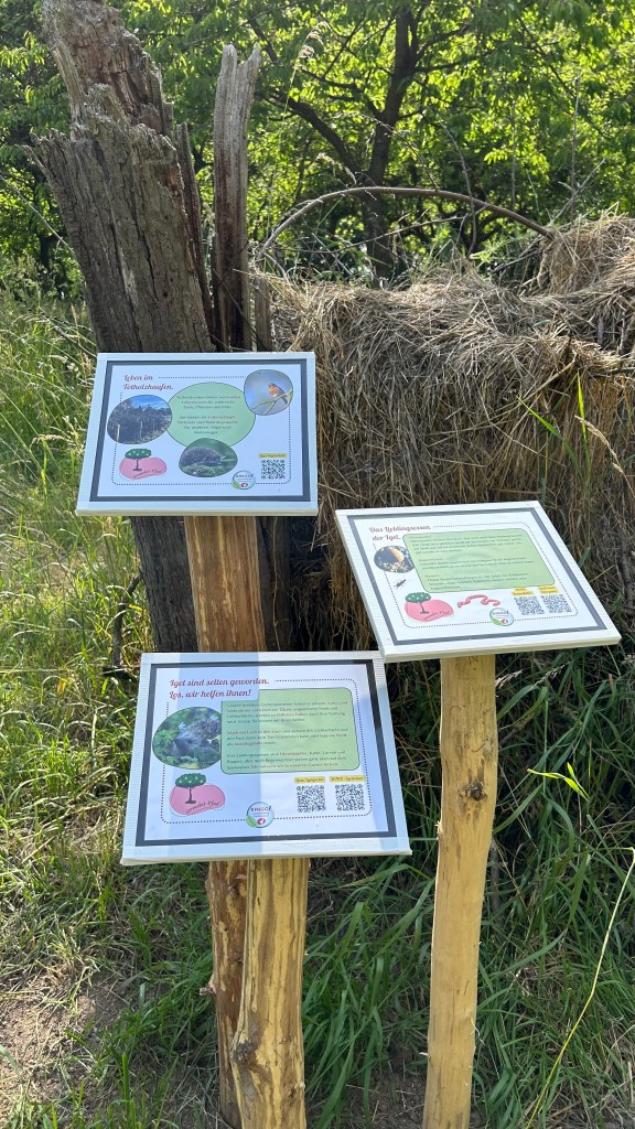Ein echtes Highlight sind unsere selbst erdachten Streuobst-Geschichten, liebevoll erzählt von unserer Erzählerin. Sie lassen Totholz, Apfelbaum, Igel & Co. auf besondere Weise zu Wort kommen – poetisch, lehrreich und fantasievoll. Die Geschichten sind über die Tafeln ebenfalls per QR-Code abrufbar.